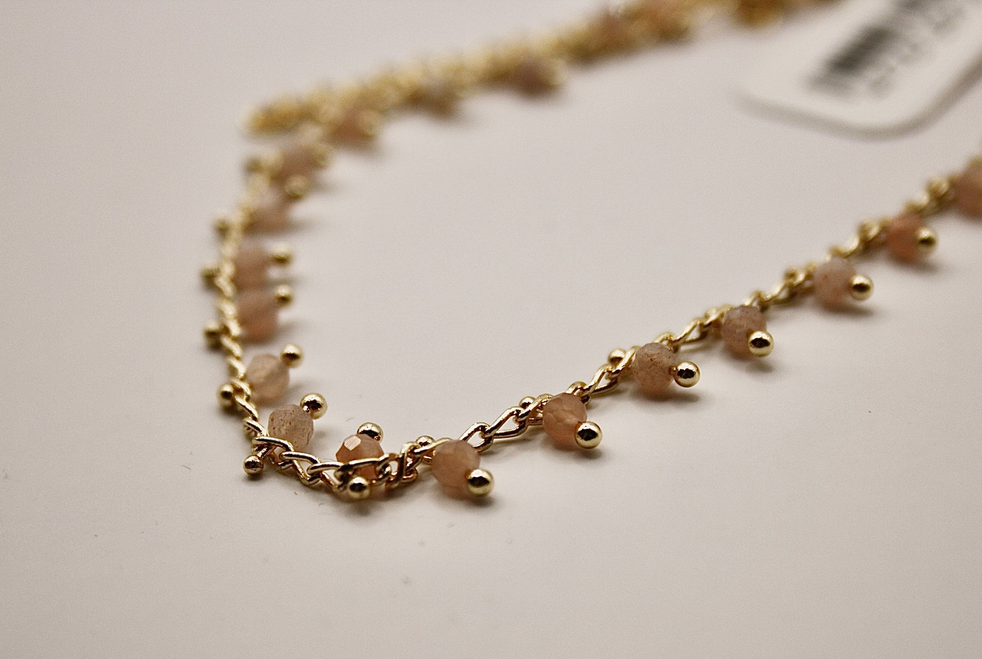 Voeg een zachte en vrouwelijke touch toe aan je sieradencollectie met deze gouden armband met lichtroze bedeltjes. De combinatie van subtiele kraaltjes en speelse bedels maakt dit sieraad perfect voor elke gelegenheid.