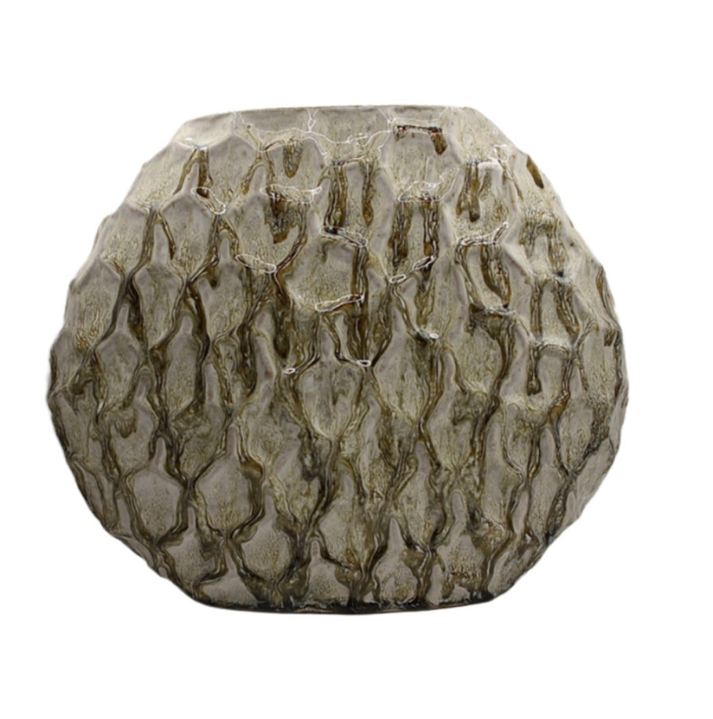De subtiele kleurnuances in het glazuur zorgen voor een spel van licht en schaduw, waardoor de vaas vanuit elke hoek een andere dimensie laat zien. Met afmetingen van 32 cm hoog, 12 cm diep en 26 cm breed heeft hij precies de juiste grootte om op te vallen zonder overweldigend te zijn.