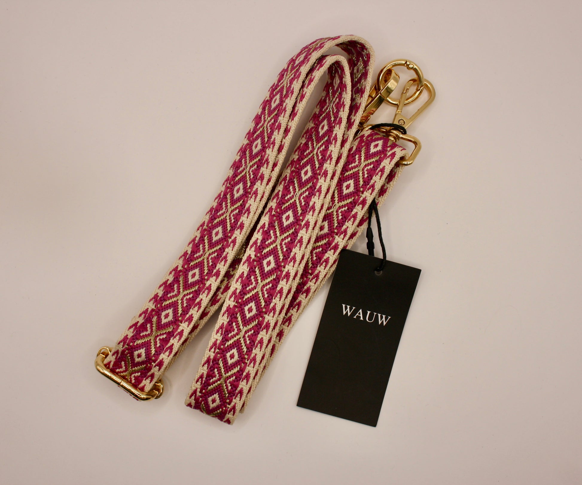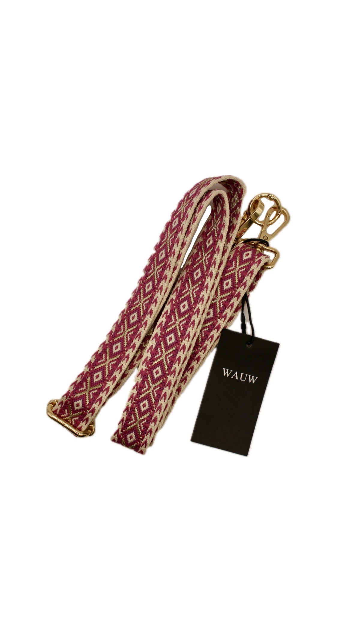 Geef je telefoon of tas een stijlvolle upgrade met dit koord in roze print met gouden details. Praktisch én trendy, perfect om je essentials altijd binnen handbereik te hebben. Draag hem crossbody of over je schouder voor een modieuze look.